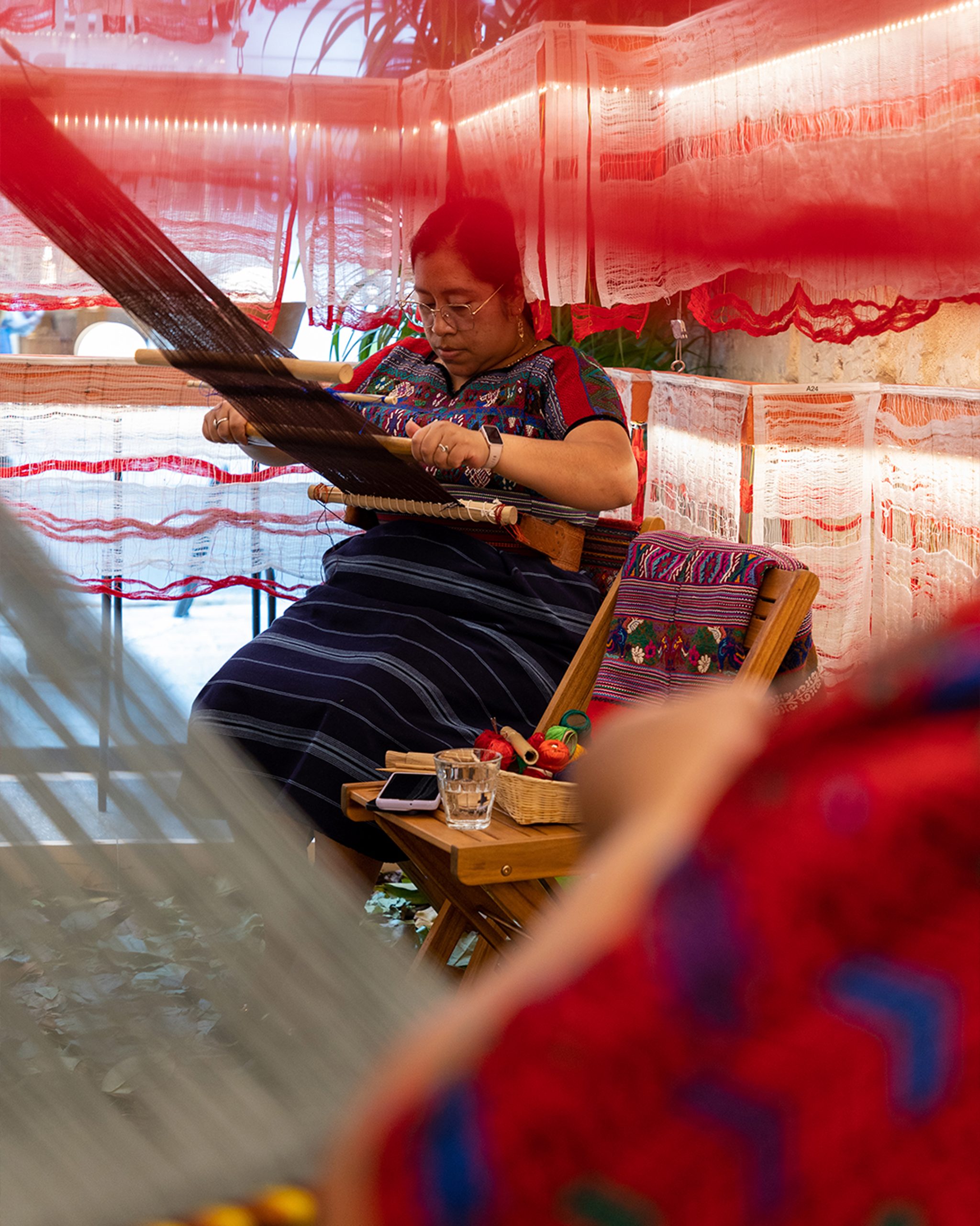 Dentro de la exposición participaron maestras tejedoras del Movimiento Nacional de Tejedoras Mayas, quienes compartieron su proceso de trabajo en el telar de cintura. Las personas que visitaron la muestra pudieron observar de cerca cómo preparan el hilo, cómo ajustan el telar y cómo avanza cada tejido con paciencia y dedicación.
